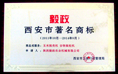 為了貫徹落實(shí)《西安市人民政府關(guān)于推進(jìn)商標(biāo)戰(zhàn)略的實(shí)施意見》,根據(jù)《西安市著名商標(biāo)認(rèn)定與保護(hù)規(guī)定》,經(jīng)2011年10月9日西安市著名商標(biāo)認(rèn)定委員會(huì)全體會(huì)議審查通過、西安市工商行政管理局批準(zhǔn),認(rèn)定陜西毅政農(nóng)業(yè)機(jī)械有限公司“毅政”商標(biāo)為西安市著名商標(biāo)。